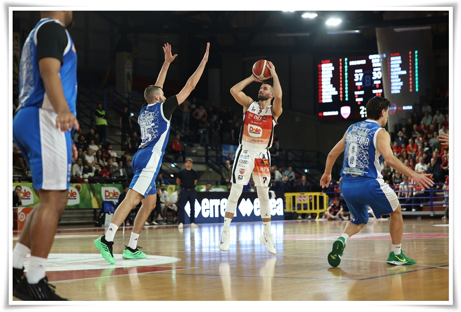 Si entra negli ultimi 10’ con la Dole in assoluto controllo. Il massimo vantaggio si amplia ulteriormente: fino al +25 (70-45) con i liberi di Camara. Sostenuta soprattutto da Jerkovic la Crifo Wines ha una reazione d’orgoglio: in due minuti piazza un parziale di 10-0 e si porta sul -15 (70-55). Ma la Dole ha la strada spianata: Tomassini va da tre per il nuovo rassicurante 73-55. In chiusura Rbr è padrona della disputa senza alcun patema d’animo: a 1’40 dal gong da segnalare la schiacciata a due mani di Sankarè (81-58) che vale il suo record di punti in carriera in A2. Resta solo più da definire il finale: è la tripla di Leardini a chiudere il match con l’84-58 finale.