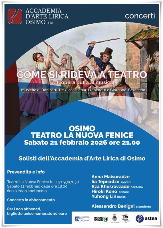 Sabato 21 febbraio, alle ore 21.00, al Teatro La Nuova Fenice l‘Accademia d’Arte Lirica propone “Come si rideva a teatro”, un concerto vivace e brioso che attraversa due secoli di comicità teatrale. Il percorso parte dall'opera buffa di Donizetti e De Giosa, passando per l'operetta viennese di Lehàr, quella italiana di Franchetti e Giordano, fino al di musical Bernstein. Attraverso arie, duetti e pezzi d’assieme si potrà seguire l'evoluzione del teatro musicale leggero, focalizzato su trame brillanti, personaggi d’irresistibile comicità, vorticosi ritmi di danza.