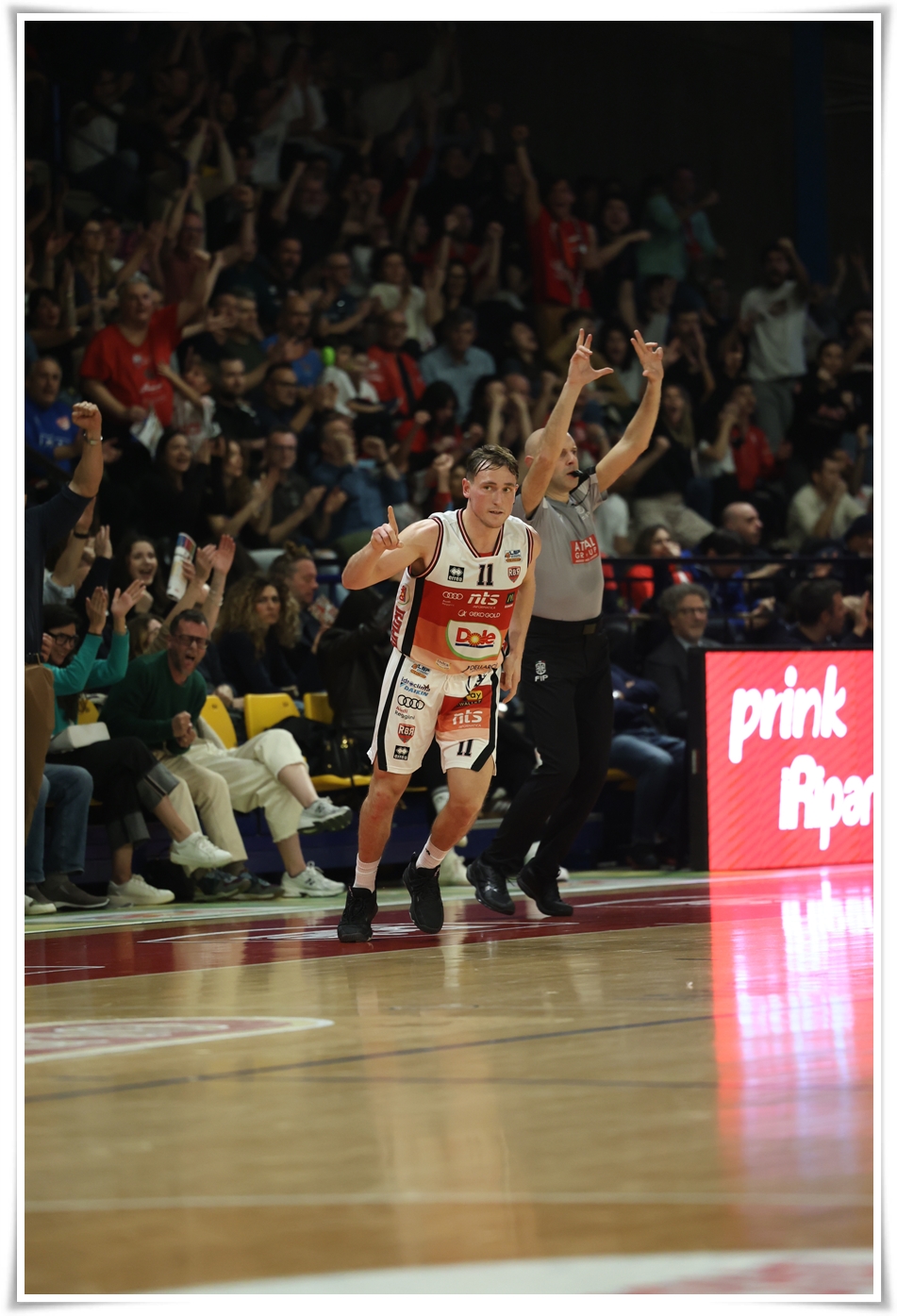 Se Brindisi si affida ancora ai tiri liberi di Francis e Copeland in apertura di quarto quarto, la Dole colpisce dai 6,75 con Tomassini prima e Denegri poi, torna in doppia cifra di vantaggio (67-56) e costringe la Valtur al timeout al 32’. È Copeland a prendersi sulle spalle i pugliesi, sbloccando l’attacco anche dal campo dopo diversi minuti, tornando in lunetta con un altro 2/2 e dando il via a un contropiede concluso da Vildera per il 69-62: secondo timeout biancorosso al 35’. Il numero 2 biancoazzurro segna anche da tre, e la partita è definitivamente riaperta: 69-65 a 5’ dalla fine. Quando il Flaminio sente la partita e si accende, la Dole fa lo stesso: 7-0 di parziale e una tripla da NBA di Marini porta coach Bucchi al timeout al 36’ (76-65). La Valtur prova a restare aggrappata alla partita, ma i biancorossi trovano un nuovo protagonista, con Ogden autore di otto punti in fila che valgono il +14. Si gioca solo per la differenza canestri, con Brindisi che ferma il gioco a 35” dalla sirena finale, ma non segna più nessuno: la Dole trionfa nella bolgia del Flaminio, 84-70.