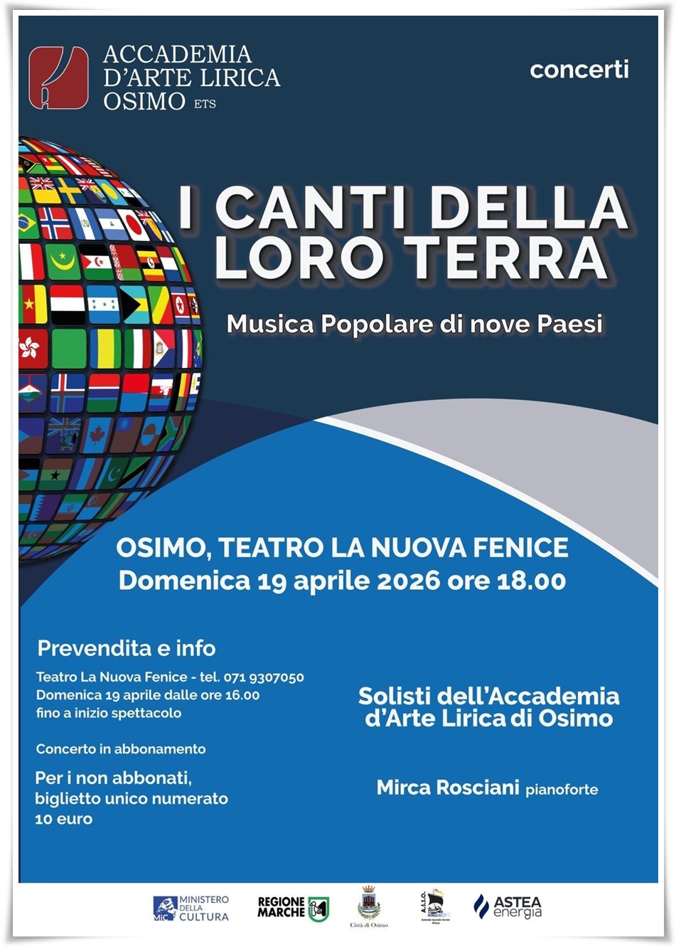 Domenica 19 aprile alle ore 18.00 al teatro La Nuova Fenice di Osimo, ritorna il tradizionale concerto de “I Canti della Loro Terra”: una festa dedicata al folklore nazionale, con un programma di canzoni popolari e di melodie tradizionali che costituiscono il patrimonio dei vari Paesi. Ventuno giovani allievi e la pianista Mirca Rosciani proporranno canti popolari di nove Paesi: Belgio, Cina, Georgia, Giappone, Italia, Tatarstan (una delle Repubbliche federali della Russia), Turchia, Ucraina, Uzbekistan. Sarà un vero e proprio viaggio musicale intorno al mondo, accompagnati dai solisti che indossano costumi tradizionali dei loro paesi. Con questo evento l’Accademia d’Arte Lirica ricorda la vocazione internazionale di un’Istituzione formativa che è punto di riferimento per i cantanti di tutto il mondo.