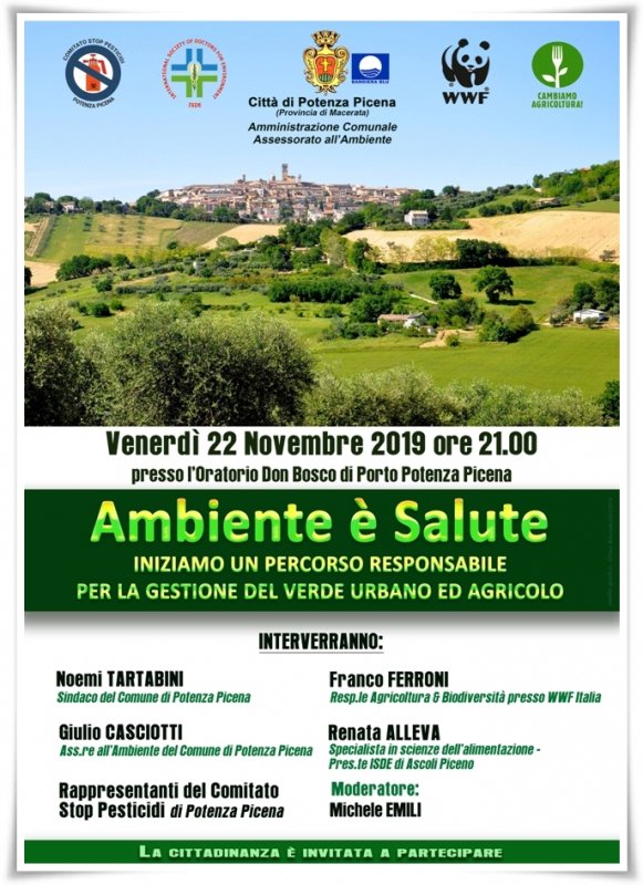 “Ambiente è Salute: iniziamo un percorso responsabile per la gestione del verde urbano ed agricolo”, è il titolo del convegno pubblico organizzato dall’Amministrazione Comunale in collaborazione con il “Comitato Stop Pesticidi” di Potenza Picena, il WWF, l’Associazione “Cambiamo Agricoltura!” e ISDE (la Società Internazionale dei Medici per l’Ambiente), in programma per venerdì prossimo, 22 novembre, alle ore 21 presso la Sala Riunioni dell’Oratorio Don Bosco di Porto Potenza Picena. Interverranno il Sindaco Noemi Tartabini, l’Assessore all’Ambiente Giulio Casciotti, il Responsabile Agricoltura e Biodiversità di WWF Italia Franco Ferroni, la Specialista in Scienze dell’Alimentazione e Presidente ISDE per la Provincia di Ascoli Piceno Renata Alleva ed i rappresentanti del Comitato locale Stop Pesticidi. “Si tratta di un primo incontro per lanciare un percorso ecologico virtuoso nella gestione del verde urbano, sia pubblico che privato, ed intraprendere un tipo di agricoltura responsabile e sostenibile dal punto di vista ambientale – ha detto l’Assessore Casciotti – sono già alcuni mesi che, insieme al Comitato Stop Pestici, stiamo lavorando ad un progetto legato al nostro territorio coinvolgendo un numero sempre più ampio di cittadini. Abbiamo già in calendario una serie di iniziative propedeutiche alle buone pratiche ambientali cadenzate nell’arco dell’anno, proprio per informare, coinvolgere e tenere viva l’attenzione dei nostri concittadini su di un tema vitale per il futuro”.