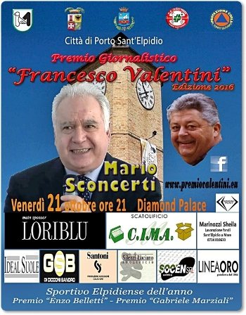 E’ giunta l’ora della sedicesima edizione del Premio Giornalistico “Francesco Valentini” che andrà in scena venerdì 21 ottobre alla ore 21 presso il Diamond Palace di Porto Sant’Elpidio. Edizione quanto mai ricca incentrata sulla premiazione del giornalista Mario Sconcerti, attuale opinionista della Domenica Sportiva. Tema della serata, a cui Sconcerti si presterà, anche con gli interventi del pubblico, è ispirato proprio da una sua opera letteraria dal titolo “Storia delle idee del calcio. Uomini, schemi e imprese di un'avventura infinita”. Il premio giornalistico è solamente il primo aspetto di un programma che prevede l’annuncio dei vincitori dello Sportivo Elpidiense dell’anno, Premio “Enzo Belletti” per gli sport individuali, Premio “Gabriele Marziali” per gli sport di squadra, eletti tramite votazione dalle società sportive elpidiensi. Da ultimo, ma non meno importante, l’assegnazione di un premio speciale che verrà svelato durante la serata.