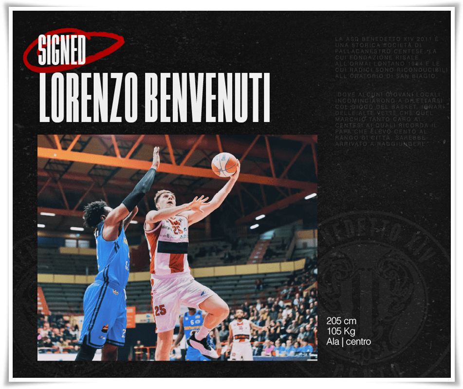 Nell’ultima stagione con la formazione romagnola, il lungo toscano ha segnato oltre 6 punti e 3 rimbalzi di media; giocatore pluridimensionale, Benvenuti è capace di essere pericoloso tanto nel pitturato, suo naturale punto di forza, quanto lontano dal canestro, avendo l’abilità di segnare anche da tre punti.
