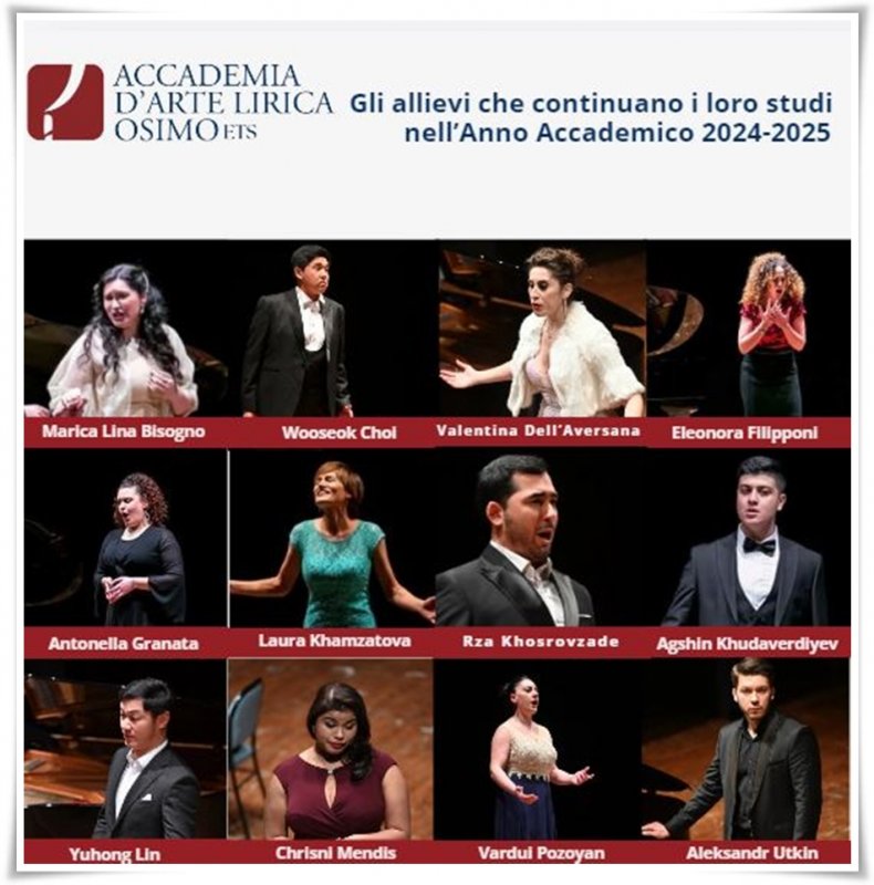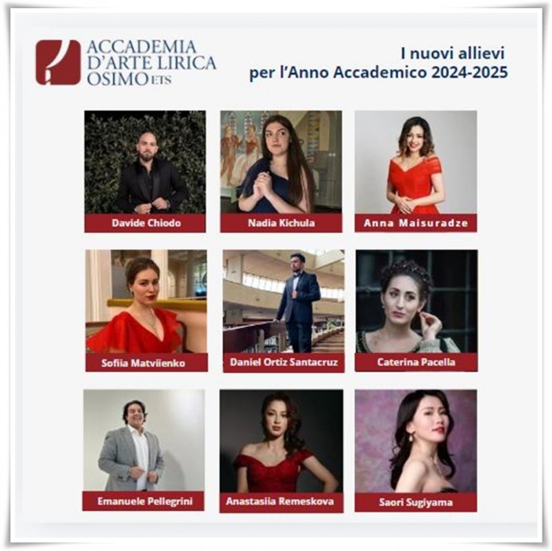 L’Accademia d’Arte Lirica aprirà il 46° Anno Accademico, martedì 12 novembre, presso la Sala Vivarini del Comune di Osimo, alla presenza del Sindaco Francesco Pirani e dell’Assessore alle Attività Culturali Federica Fantasia, che daranno il saluto di benvenuto agli allievi e ai docenti della prestigiosa istituzione formativa. Sarà l’occasione per conoscere i nuovi artisti selezionati per il biennio accademico 2024-2026: sono il baritono Davide Chiodo, il soprano Caterina Pacella e il tenore Emanuele Pellegrini dall’Italia; i soprani Nadia Kichula, Anna Maisuradze e Sofiia Matviienko dall’Ucraina; il tenore Daniel Ortiz Santacruz dalla Colombia; il soprano Anastasiia Remeskova dalla Russia; il mezzosoprano Saori Sugiyama dal Giappone. A loro si aggiungono i dodici allievi che proseguono il loro percorso didattico: le italiane Marica Lina Bisogno, Valentina Dell'Aversana, Eleonora Filipponi, Antonella Granata, il sudcoreano Wooseok Choi, tenore, i russi Laura Khamzatova e Aleksandr Utkin, gli azeri Rza Khosrovzade e Agshin Khudaverdiyev, il cinese Yuhong Lin, la srilankese Chrisni Mendis, la georgiana Vardui Pozoyan. Come di consueto, la presenza internazionale di giovani cantanti, che scelgono l’Accademia Osimana per perfezionare il proprio talento vocale, è assai rilevante. L’Accademia è infatti il punto di partenza per la carriera di molti artisti: solo negli ultimi mesi il basso Maharram Huseynov ha cantato nella Messa di Requiem di Verdi sotto la direzione di Riccardo Muti a Parigi e a Philadelphia, il baritono Matteo Torcaso ha interpretato il Sagrestano nella Tosca diretta da Daniele Gatti al Teatro del Maggio a Firenze, il mezzosoprano Eleonora Filipponi ha preso parte alla Nona Sinfonia di Beethoven diretta da Daniele Gatti all’Accademia di Santa Cecilia di Roma, e da John Eliot Gardiner con l’Orchestra Mozart a Bologna.