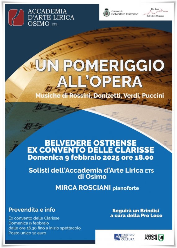 Belvedere Ostrense offre un affascinante concerto vocale, domenica 9 febbraio, alle ore 18.00, nell’ex Convento delle Clarisse: Un pomeriggio all’opera. I solisti dell’Accademia d’Arte Lirica con la pianista Mirca Rosciani eseguiranno arie e duetti tratti dalle pagine più note di Wolfang Amadeus Mozart, Giochino Rossini, Gaetano Donizetti, Vincenzo Bellini, Giuseppe Verdi e Giacomo Puccini, del quale lo scorso anno si è celebrato il centenario della morte.