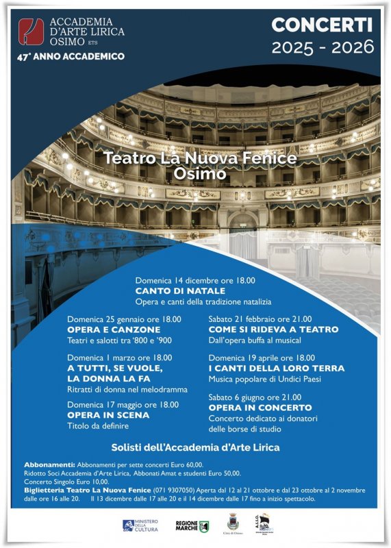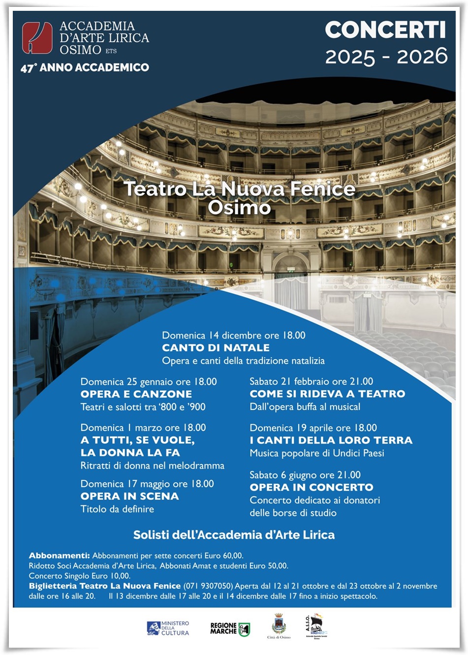 Si aprono gli abbonamenti per la nuova stagione concertistica dell’Accademia d’Arte Lirica di Osimo: un ricco cartellone di concerti da dicembre 2025 a giugno 2026. I sette appuntamenti sul palco del Teatro La Nuova Fenice vedranno protagonisti i solisti dell’Accademia. Sono giovani cantanti provenienti da 11 nazioni, che perfezionano il loro talento presso la storica Istituzione osimana. Si comincia domenica 14 dicembre, alle ore 18.00, con il tradizionale “Canto di Natale”: arie d’opera e canti della tradizione natalizia. Domenica 25 gennaio, alle ore 18.00, “Opera e canzone” con le musiche che animavano i teatri e i salotti tra ‘800 e ‘900. Sabato 21 febbraio, alle ore 21.00, “Come si rideva a teatro”, scatena la comicità dell’opera buffa, i doppi sensi dell’operetta e le ironie graffianti del musical. Domenica 1 marzo, alle ore 18.00, protagoniste femminili “A tutti, se vuole, la donna la fa” è un viaggio musicale nell'universo femminile del melodramma. Domenica 19 aprile si accendono i ritmi del folklore con “I Canti della loro Terra”, musica popolare di undici paesi. Domenica 17 maggio, alle ore 18.00, “Opera in scena” offrirà un titolo d’opera, scelto per far debuttare i cantanti del nuovo anno accademico, il quarantasettesimo dalla fondazione. Si conclude sabato 6 giugno alle ore 21.00 con “Opera in concerto”, serata dedicata ai donatori delle borse di studio, in cui verranno consegnati gli attestati agli allievi che termineranno il loro percorso accademico.