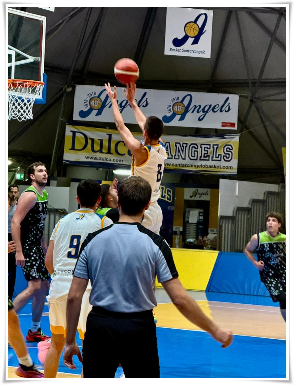 Continua la striscia positiva dei gialloblu che giocano un basket intenso e di qualità. Nel primo quarto Santarcangelo parte forte, con un ispiratissimo Longo, segnando venti nei primi 7’ e lasciando Faenza a 8 che si riprende sul finire del quarto e alla fine dei primi 10’ il tabellone dice 24-14 per i padroni di casa. Nel secondo periodo i faentini, con l’alternanza di difesa a zona e a uomo, ricuciono il gap portandosi, complice anche il calo di intensità dei padroni di casa, sul -1 37-36 alla pausa lunga. Al rientro dagli spogliatoi entrambe le squadre faticano a trovare il fondo della retina. Santarcangelo riesce comunque ad aumentare leggermente le distanze portando il punteggio a 53-48 a fine periodo. Nell'ultimo quarto i padroni di casa grazie a una ritrovata intensità difensiva riesce a pizzare l allungo decisivo con canestri facili in transizione, ribaltando così il risultato dell'andata.
