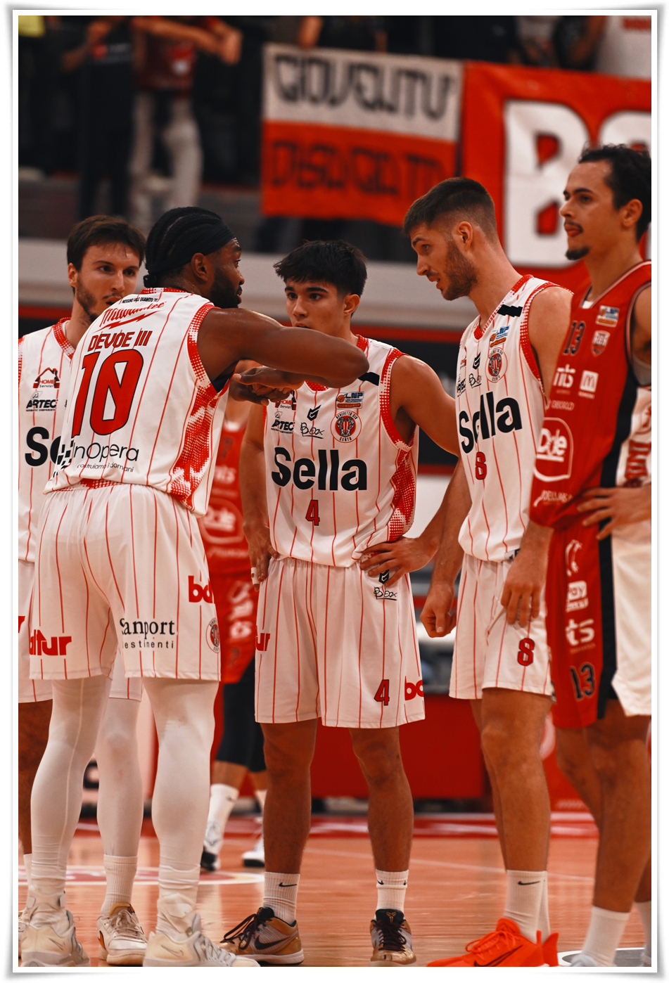Nel secondo periodo Rimini continua a capitalizzare sui secondi possessi e tocca il +19 sul 13-32, dando alla partita una direzione ben definita. La Sella però reagisce: due triple di Tanfoglio e l’energia di Davis riaprono il match riportando i biancorossi a -11 (25-36), margine che resta invariato fino all’intervallo, lasciando ancora uno spiraglio.