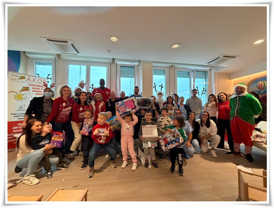 A rappresentare il club erano presenti il capitano Giovanni Tomassini, il centro Gora Camara, l’Amministratore Delegato Paolo Carasso e il team comunicazione, accompagnati dal Presidente di Arop Roberto Romagnoli, dalla responsabile marketing di Dole Italia Cristina Bambini e dai partner storici Dulca e Acrobatica. La consegna dei doni si è svolta nella sala d’attesa del reparto, trasformata per l’occasione in un luogo di sorrisi e stupore.