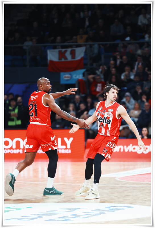 La partita diventa una vera e propria battaglia salvezza, con entrambe le squadre pronte a dare tutto. A 3’ dalla fine Tiberti segna il +2 su assist di Devoe, poi in difesa subisce uno sfondamento da Stephens. Aradori inventa un canestro difficilissimo da dietro al tabellone, ma ancora Tiberti riporta il punteggio in parità a 2’ dalla sirena.