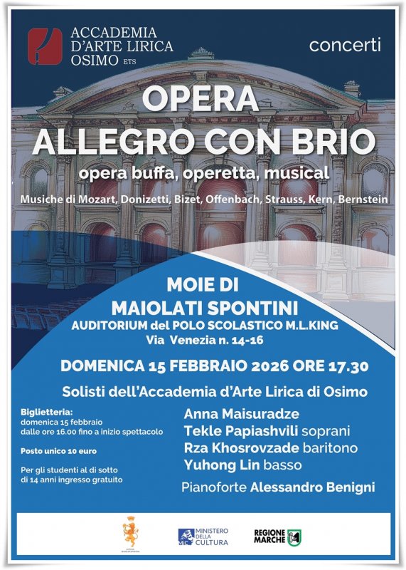 Domenica 15 febbraio, alle ore 17.30, presso l’Auditorium del polo scolastico M.L. King di Moie di Maiolati Spontini, l’Accademia d’Arte Lirica propone “Opera allegro con brio”: arie, duetti e pezzi d’assieme di grande vivacità e allegria.
