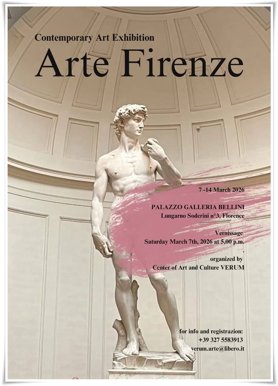 "ARTE FIRENZE” edizione 2026 evento organizzato dal Centro d’ Arte e Cultura VERUM curato dalla prof.ssa Marianna Jurcova e dal curatore Mauro Giampieri, presso le prestigiose sale espositive del Palazzo Galleria Bellini di Firenze
