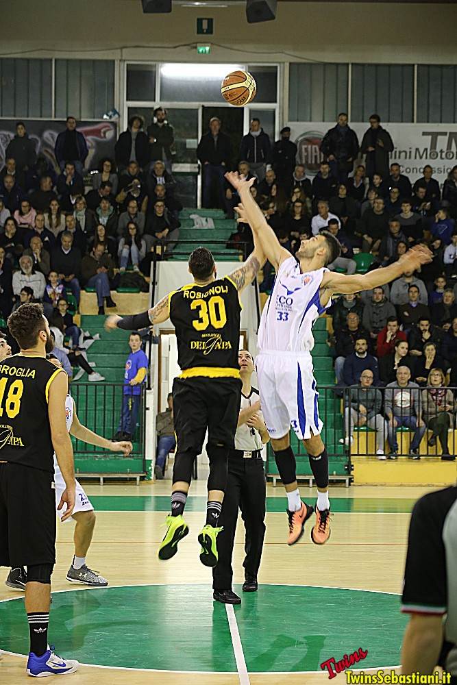 PORTO SANT’ELPIDIO – Il derby va alla Poderosa Montegranaro che come da pronostico espugna il palasport di Via Ungheria e continua il braccio di ferro con San Severo in testa alla classifica. Gara a senso unico o quasi quella giocata davanti a quasi 2000 spettatori che di certo hanno contribuito a rendere speciale un atmosfera da Serie A. La Ecoelpidiense Stella non ha avuto scampo contro una corazzata come la Poderosa rinforzata anche dall’innesto di Diomede autore di 15 punti e tra i migliori per i suoi ma ci ha messo anche del suo con una giornata non particolarmente felice soprattutto in attacco dove le troppe palle perse hanno amplificato la superiorità ospite. Montegranaro a gran ritmo fin dall’inizio con Marco Rossi scatenato, al primo intervallo è già vantaggio in doppia cifra per i gialloneri (12-23). Il trend non si inverte neanche nei secondi dieci minuti quando la fisicità di Gatti e compagni è lampante mentre sponda biancoazzurra è decisamente pessima la giornata di Tortù costretto spesso in panca causa falli. All’intervallo il 25-41 certifica la supremazia ospite. Con la forza della disperazione PSE torna fino al -11 grazie al cuore enorme di Torresi e ai canestri di Caridà ma è soltanto un un lampo perché in un amen Gatti e Diomede riportano Montegranaro a +19 (43-62). L’ultima frazione non cambia le sorti di una gara già segnata. Finisce 59-79 per la Poderosa, vince con merito la squadra di coach Steffè ma a vincere è anche il tifo elpidiense a dir poco commovente: pubblico tutto in piedi ad applaudire, ultras scatenati che continuano ad osannare i propri giocatori nonostante il -20. Una lezione di tifo, di cultura sportiva e una dimostrazione di sconfinato amore verso la propria squadra. Chapeau.