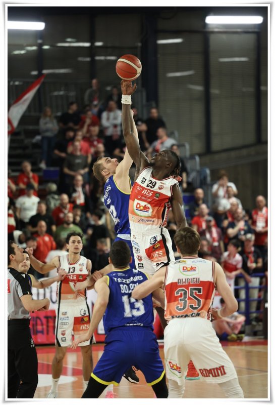 Per la Dole c’è Ivan Alipiev in quintetto insieme a Denegri, Marini, Leardini e Camara; Verona sceglie Spanghero, McGee, Bolpin, Johnson e Poser. Rimini parte bene, 8-2 con cinque di Camara e tripla di Marini, Verona cavalca Poser, Bolpin e McGee per il primo vantaggio a metà quarto (8-9). Difese ed errori la fanno da padroni, ma Rimini si sblocca da tre con Saccoccia, Tomassini e Simioni; a segno anche Loro ma la Dole allunga fino al massimo vantaggio, +7, che resiste fino a fine primo quarto: 23-16 dopo 10’.