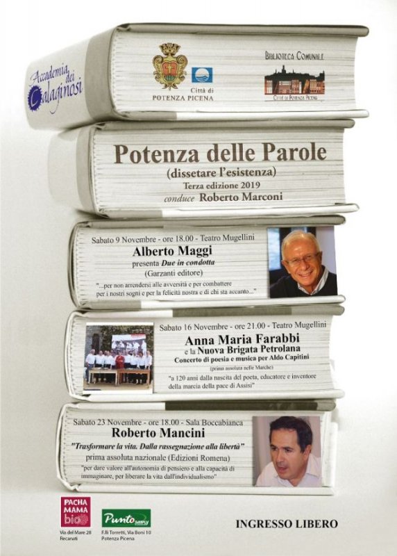 Sabato 9 novembre si inaugura la 3ª edizione di “Potenza delle Parole”, rassegna culturale a Potenza Picena (Mc) patrocinata dal Comune e organizzata dall’associazione “Accademia dei Calaginosi” che gestisce la locale biblioteca comunale. Nel corso degli appuntamenti, condotti da Roberto Marconi, si alterneranno: autobiografia e teologia (con Alberto Maggi), canti popolari e poesia (con Anna Maria Farabbi e la Nuova Brigata Petrolana il 16 novembre) e saggistica (Roberto Mancini il 23 novembre).