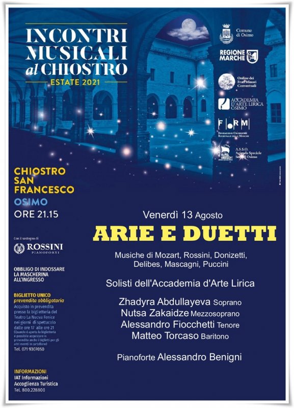 Venerdì 13 Agosto, alle ore 21.15, l’Accademia d’Arte Lirica di Osimo torna nell’affascinante cornice del Chiostro San Francesco: i solisti dell’istituzione osimana, con il pianista Alessandro Benigni, propongono “Arie e Duetti”. Il programma parte da Mozart - con brani tratti dal Così fan tutte e dal Don Giovanni - prosegue con Rossini – con arie da Italiana in Algeri e Cambiale di Matrimonio - e Donizetti - con scene da L’Elisir D’Amore - per continuare con Delibes di Lakmè. Si conclude con il Mascagni de Le Maschere e il Puccini de La Bohème.